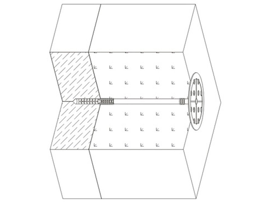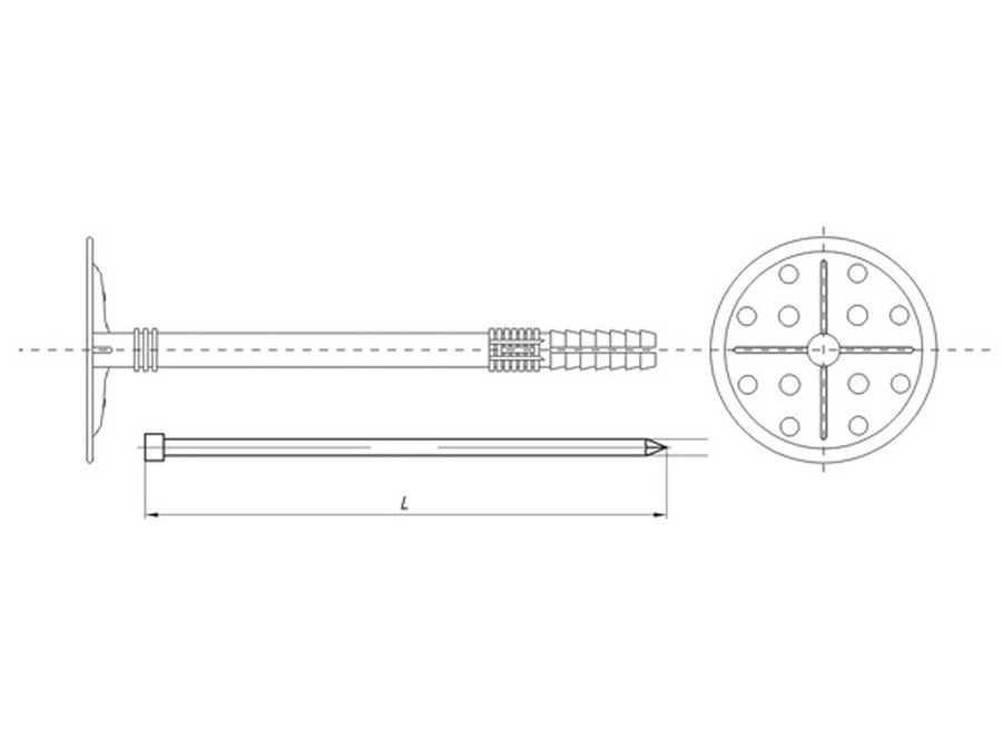- Монтаж: фиксация дюбеля в стене производится путем забивания пластикового или металлического распорного гвоздя, на 1 кв.м монтируемой изоляции рекомендуется использовать 4-5 дюбелей. Для длины дюбеля 140 мм и более, а также для монтажа тяжелых конструкций рекомендуется применять металлический гвоздь