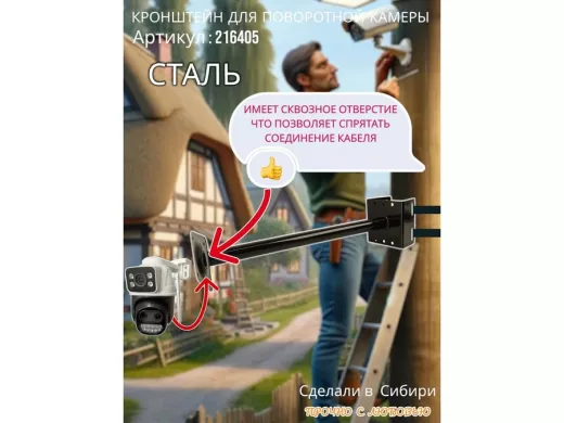 - Кронштейн для крепления видеокамеры на столб имеет сквозное отверстие, что позволяет спрятать соединения кабеля, тем самым защищает их от внешних воздействий (дождь, снег, ветер) поэтому нет необходимости использовать дополнительный гермобокс, т.к. разъемы спрячутся в трубе.