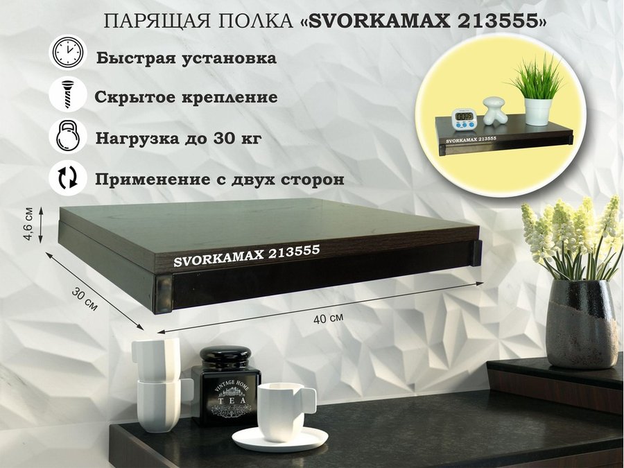В корзину Купить в 1 клик Парящая полка скрытого крепления, каркас из металла , черный "SVORKAMAX 213555" 30х40 см, венге