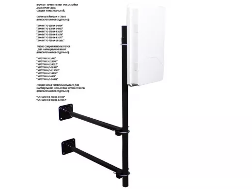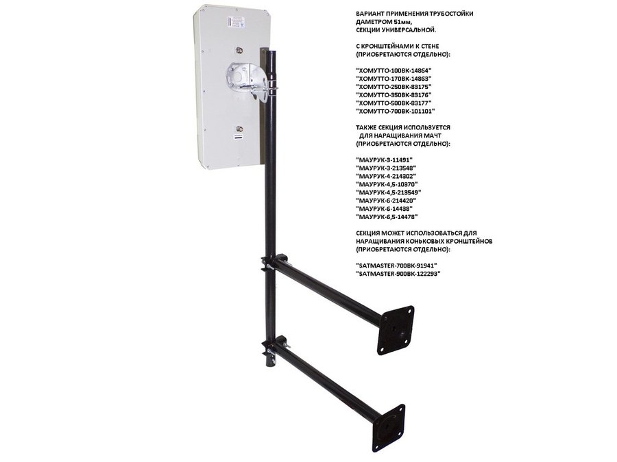 - Данную секцию можно использовать в качестве как нижнего звена мачты , т.к. в нижней части секции есть отвестия для установки подпятника, так и в качестве среднего или верхнего звена за счёт наличия болта для фиксации звена к звену на одном конце секции и обжатия трубы на другом конце. Также применяется с кронштейнами "ХОМУТТО" для крепления к стене и на торец крыши анттенн, также подходит для коньковых кронштейнов серии "SATMASTER-700", "SATMASTER-900".