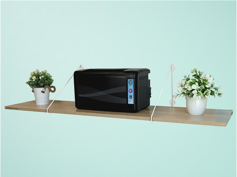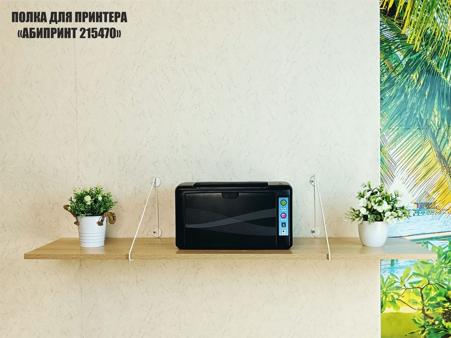 - Полка надежно крепится к стене при помощи анкеров или шурупов с дюбелями, на ней можно разместить принтер, бумагу