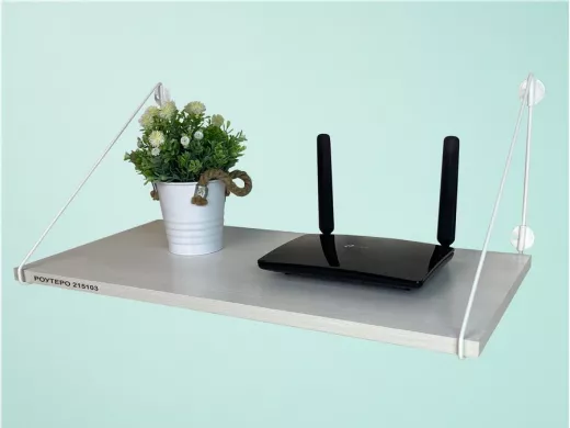- Полка надежно крепится к стене при помощи анкеров или шурупов с дюбелями, на ней можно разместить роутер и многое другое