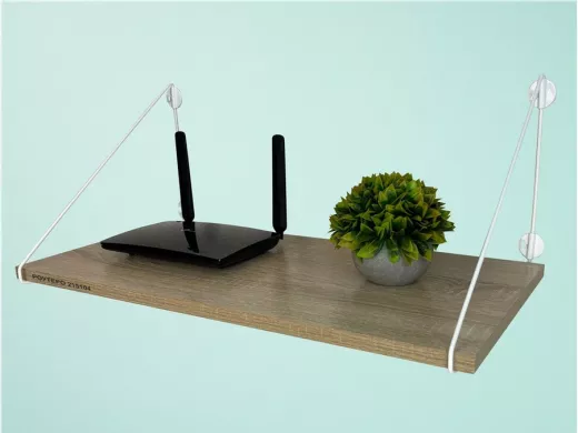 - Полка надежно крепится к стене при помощи анкеров или шурупов с дюбелями, на ней можно разместить роутер и многое другое