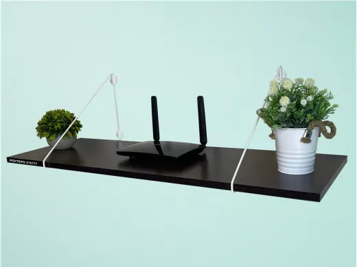 - Полка надежно крепится к стене при помощи анкеров или шурупов с дюбелями, на ней можно разместить роутер