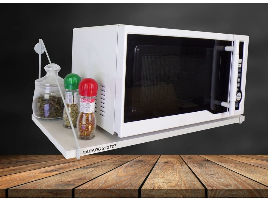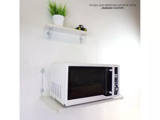 - Полка надежно крепится к стене при помощи анкеров или шурупов с дюбелями, на ней можно разместить микроволновую печь, кухонную технику, посуду, специи и многое другое
