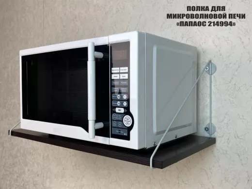 - Полка надежно крепится к стене при помощи анкеров или шурупов с дюбелями, на ней можно разместить микроволновую печь, кухонную технику, посуду, специи и многое другое