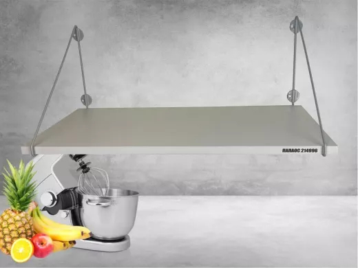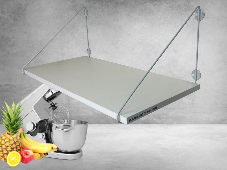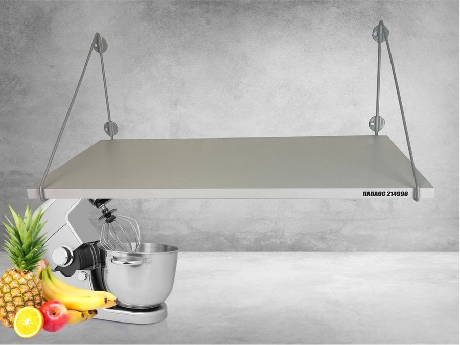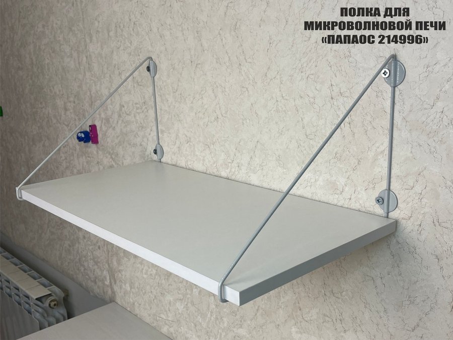 - Полка надежно крепится к стене при помощи анкеров или шурупов с дюбелями, на ней можно разместить микроволновую печь, кухонную технику, посуду, специи и многое другое