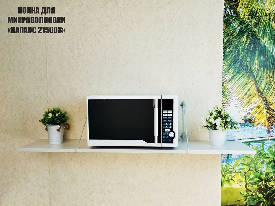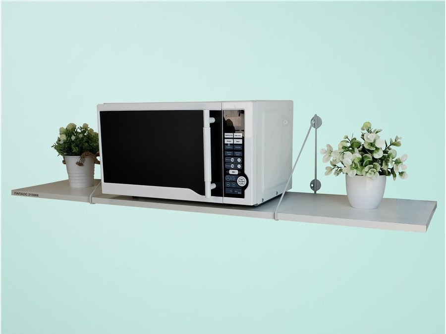 - Полка надежно крепится к стене при помощи анкеров или шурупов с дюбелями, на ней можно разместить микроволновую печь, кухонную технику, посуду, специи