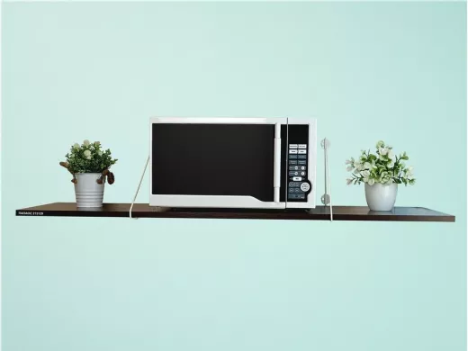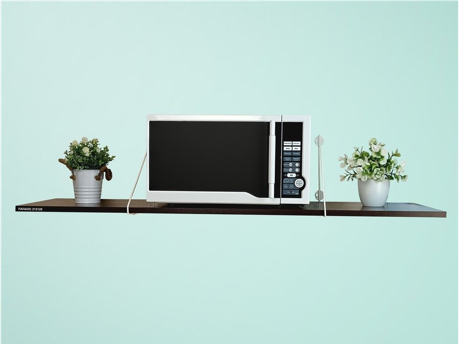 - Полка надежно крепится к стене при помощи анкеров или шурупов с дюбелями, на ней можно разместить микроволновую печь, кухонную технику, посуду, специи