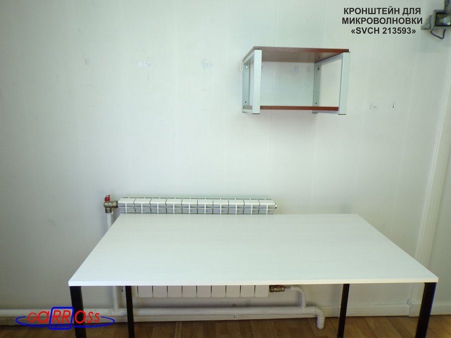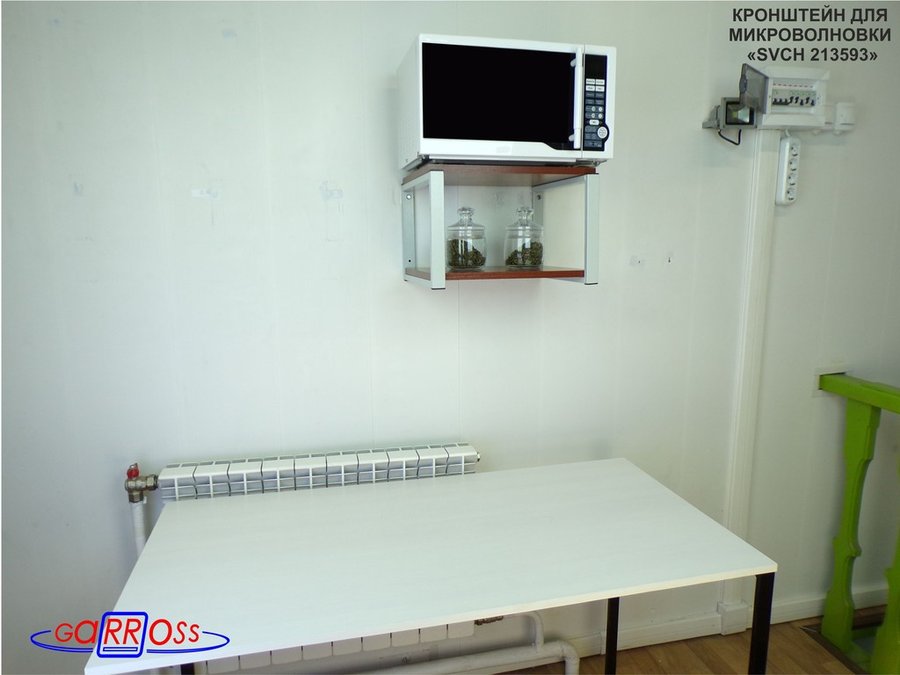 - Полка надежно крепится к стене при помощи шурупов с дюбелями, на ней можно разместить микроволновую печь, тостер, кофемашину, чайник, посуду, специи