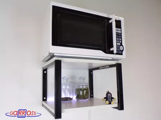 - Полка надежно крепится к стене при помощи анкеров или шурупов с дюбелями, на ней можно разместить микроволновую печь, кухонную технику, посуду, специи