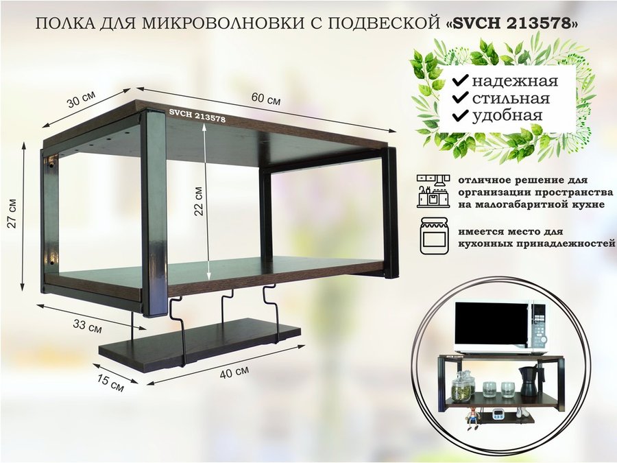 Полки для микроволновок "SVCH" кронштейны для СВЧ печей, высота 27см, 60х30см, 1 бокал, полот,крюч