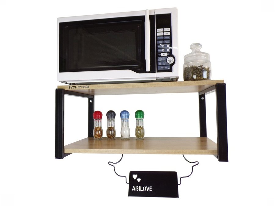 - Полка надежно крепится к стене при помощи анкеров или шурупов с дюбелями, на ней можно разместить микроволновую печь, кофемашину, тостер идр.кухонную технику, посуду, специи, различные необходимые мелочи