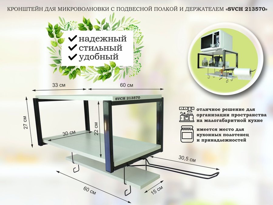 Полки для микроволновок "SVCH" кронштейны для СВЧ печей, высота 27см, 60х30см, подвеска 60 и держат