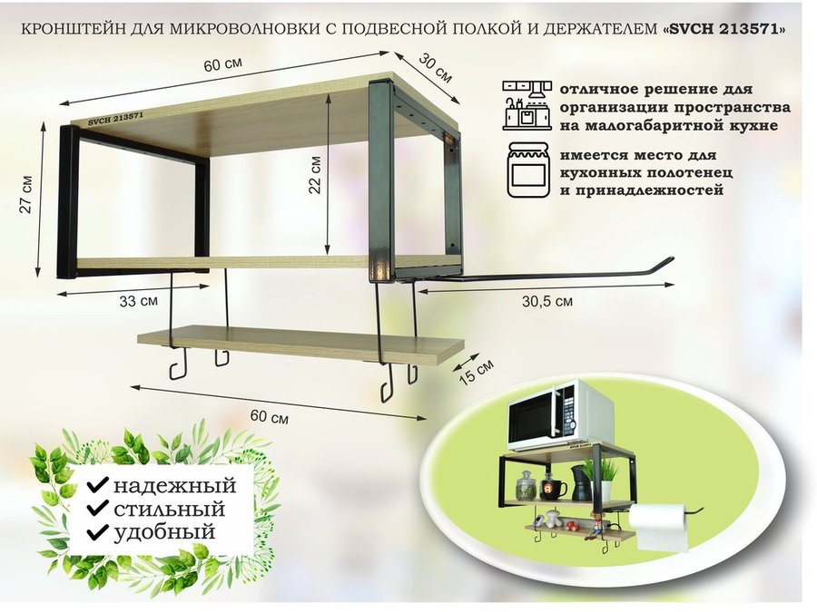 В корзину Купить в 1 клик Полка для микроволновки с подвесной полкой и держателем полотенец,черная "SVCH 213571" 60х30см, дуб