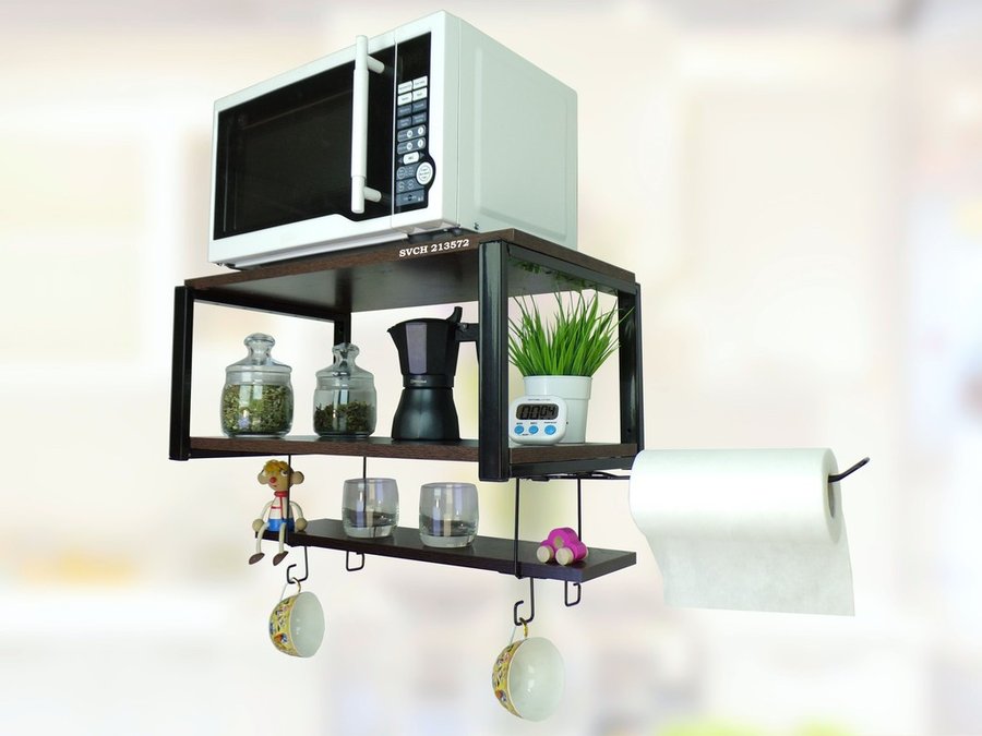 - На верхней полке можно разместить микроволновую печь или другую кухонную технику, на средней отлично "встанет" посуда, баночки под сыпучее и многое другое, а нижняя полка отлично подойдет для специй, таймера или маленьких сувениров