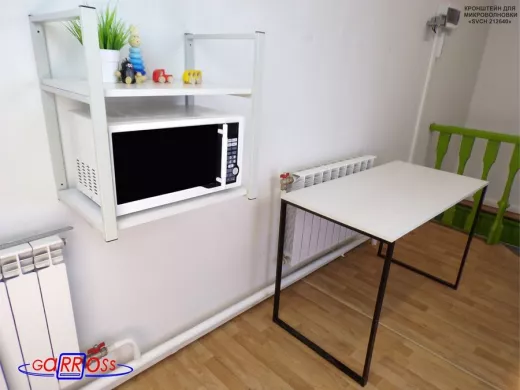 - Полка надежно крепится к стене при помощи анкеров или шурупов с дюбелями, на ней можно разместить микроволновую печь, кухонную технику, посуду, специи