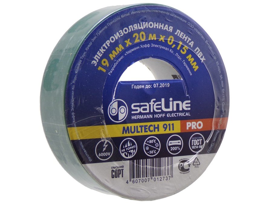 В корзину Купить в 1 клик Изолента 19мм х 20метров зеленая SafeLine MULTECH 900 0,15мм