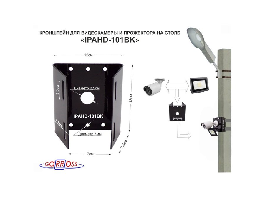 Кронштейн для 1 камеры и прожектора на столб, прочная сталь 2мм черный "IPAHD-101BK-89766" под ленту
