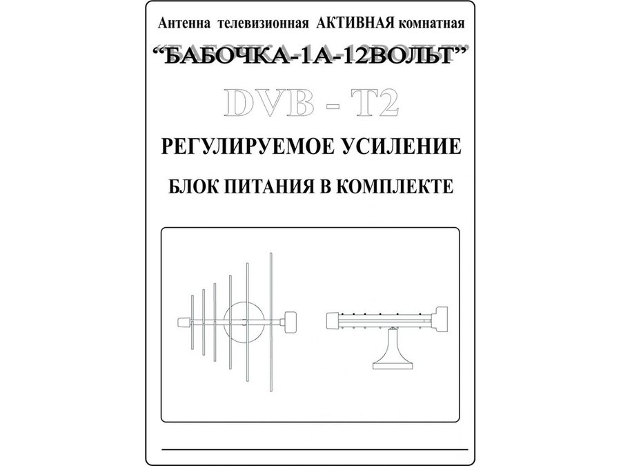 • "БАБОЧКА- 1А-5ВОЛЬТ" АКТИВНАЯ комнатная телевизионная антенна предназначена для приема цифрового DVB-T2 и аналогового телевизионного сигнала ДМВ диапазона