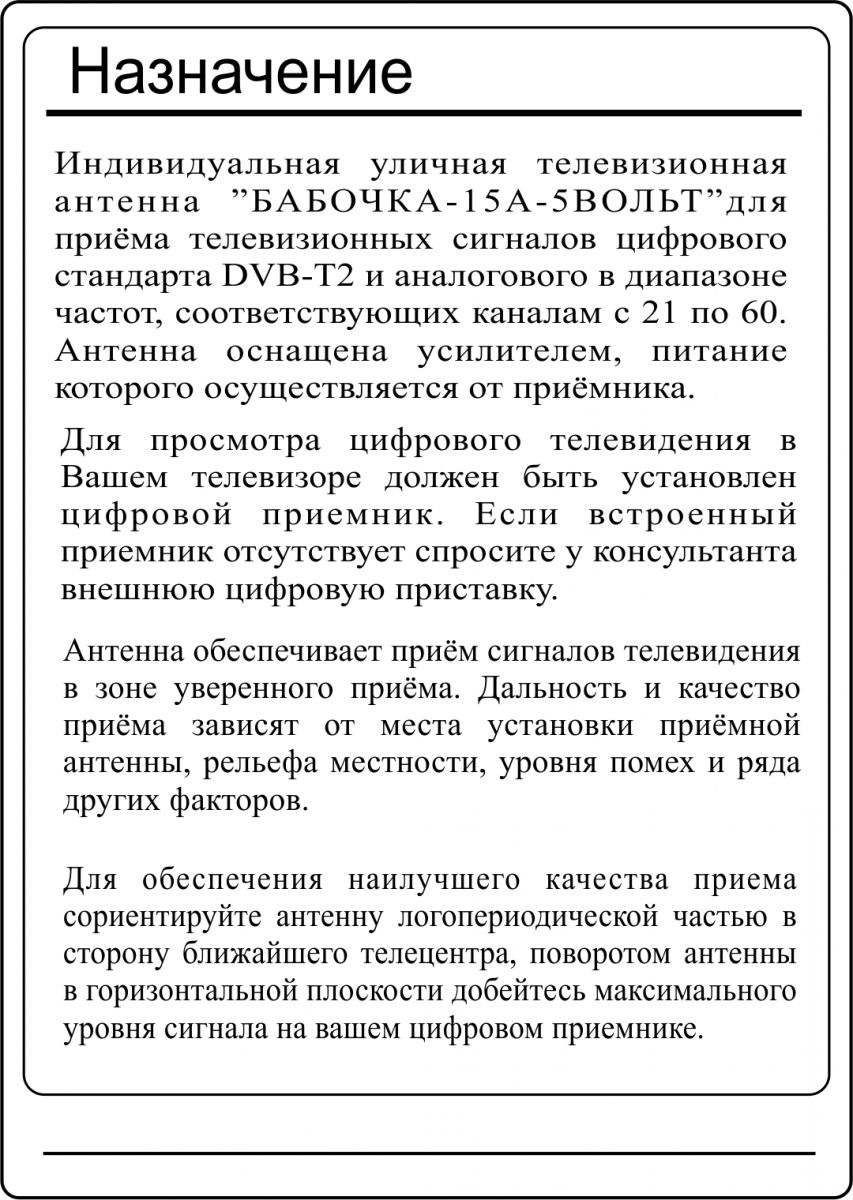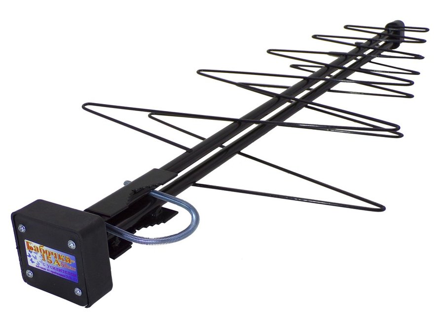 • "БАБОЧКА-15А-5ВОЛЬТ" РЕГУЛИРУЕМАЯ АКТИВНАЯ ЧЁРНАЯ уличная телевизионная антенна предназначена для приема цифрового DVB-T2 и аналогового телевизионного сигнала ДМВ диапазона