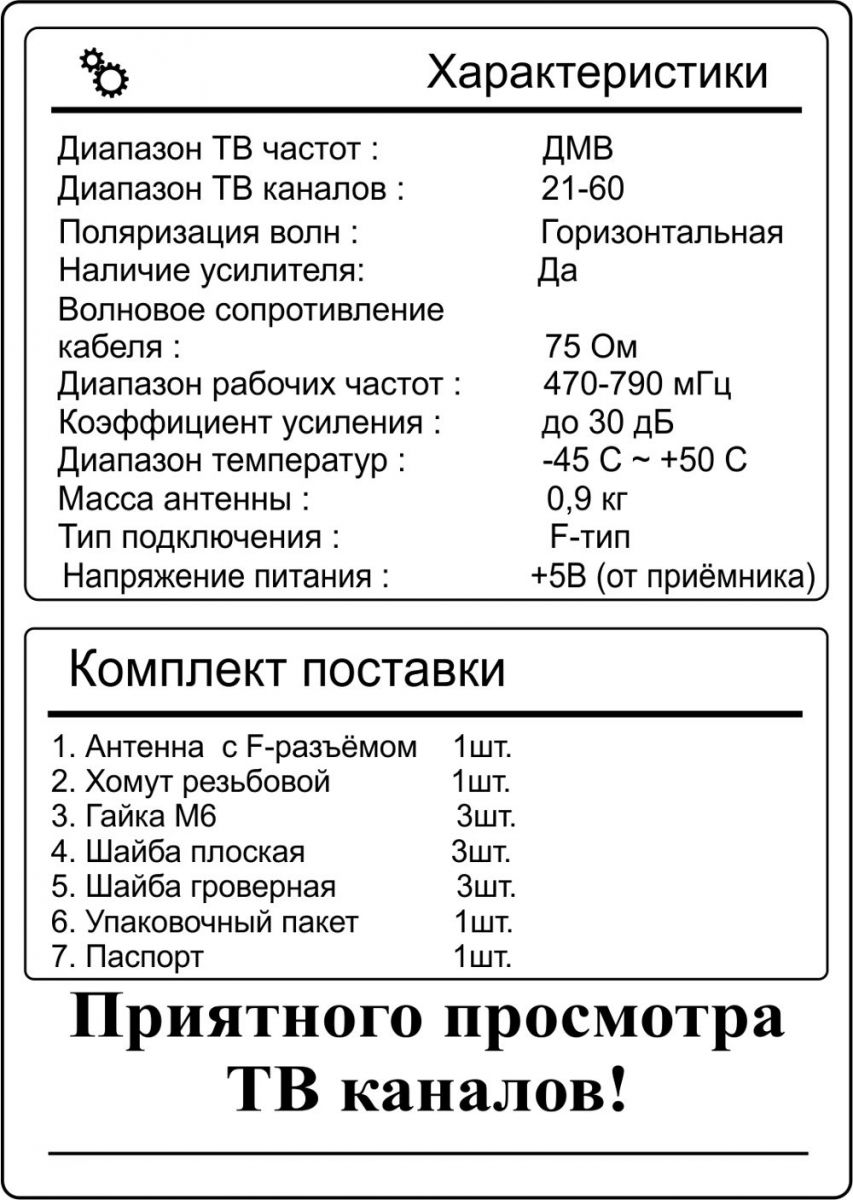 • Антенна содержит встроенный усилитель телевизионного сигнала