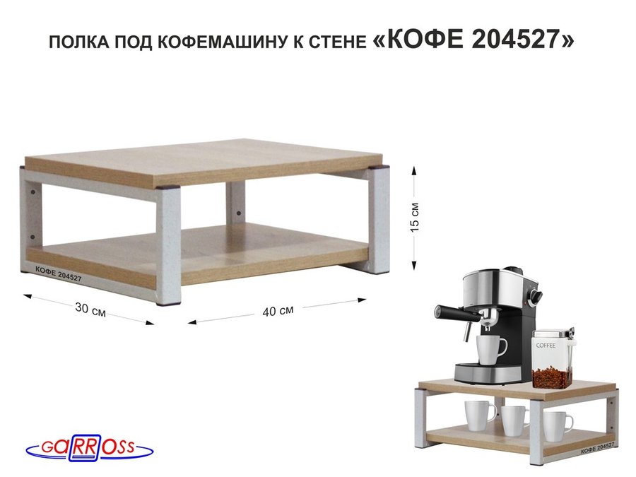 В корзину Купить в 1 клик Полка под кофемашину к стене, высота 17см, серый каркас "КОФЕиЯ 204527" полки 30х40см, дуб
