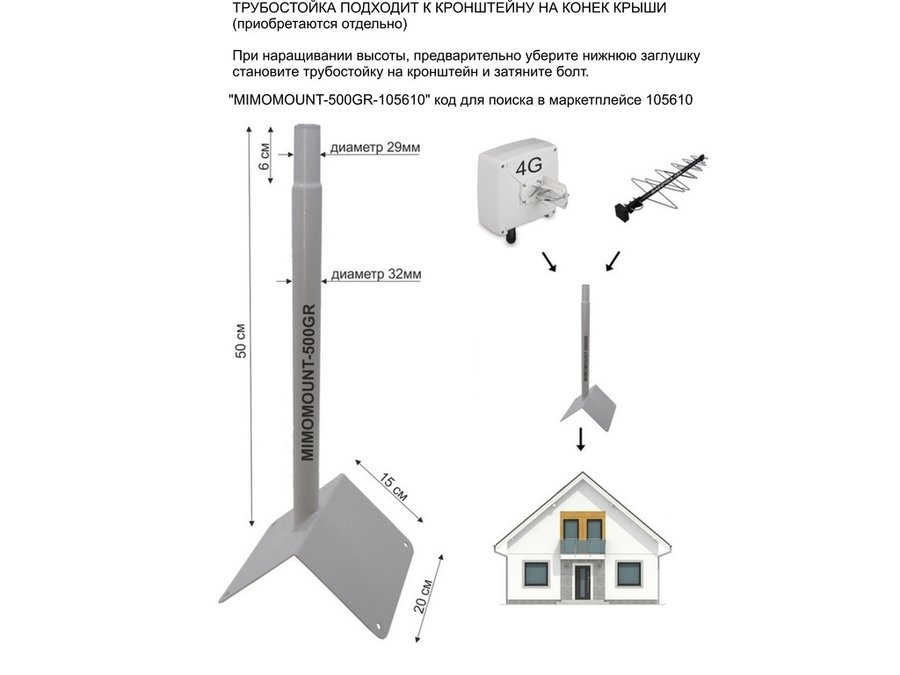 Применяется для наращивания длины антенных кронштейнов, совместима с креплениями к стене и на конек крыши: