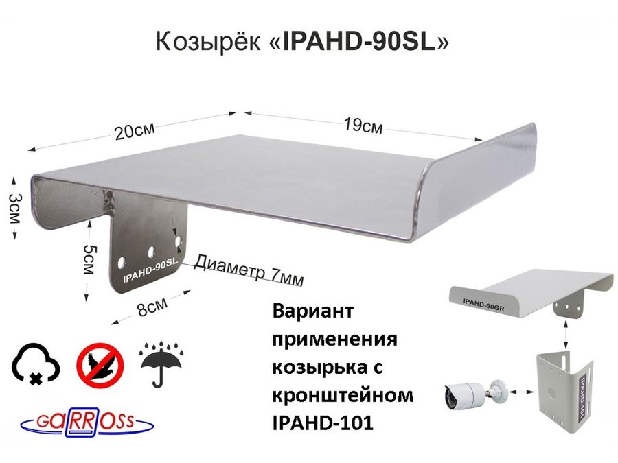 В корзину Купить в 1 клик Козырёк для камер видеонаблюдения "IPAHD-91SL-216852" серебристый для кронштейнов IPAHD, 2мм,19х20см
