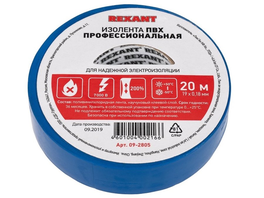 В корзину Купить в 1 клик Изолента 19мм х 20метров синяя REXANT профессиональная 0,18