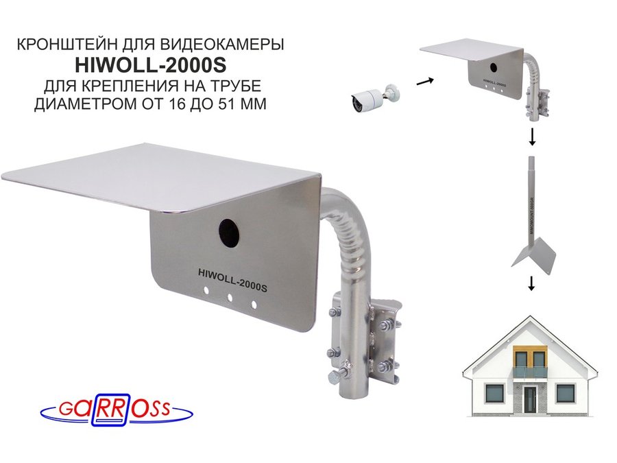 В корзину Купить в 1 клик Кронштейн "HIWOLL-2000S-201358" серебристый с хомутами и козырьком на мачту для камеры и прожектора