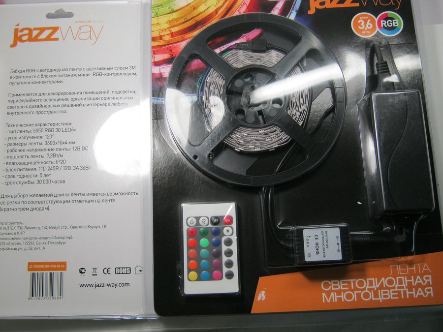 В корзину Купить в 1 клик JazzWay Блистер LED SMD 5050/30-RGB IP20 3.6 м с блоком питания и пультом ZC-F5050BL30B-RGB-BL3.6