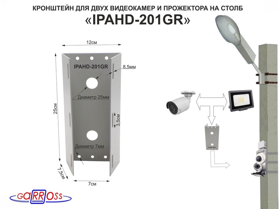 В корзину Купить в 1 клик Кронштейн для двух камер и прожектора на столб серый "IPAHD-201GR-122429" под СИП-ленту, вылет 80мм