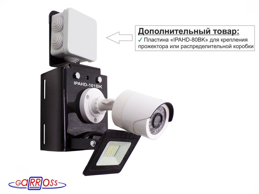 • Конструкция кронштейна позволяет крепить дополнительную опцию в виде разводной коробки, для укладки соединительных электропроводов от камеры и прожектора.