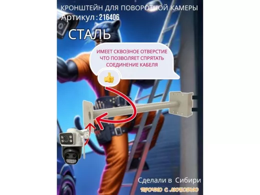 • Кронштейн для крепления видеокамеры на столб имеет сквозное отверстие, что позволяет спрятать соединения кабеля, тем самым защищает их от внешних воздействий (дождь, снег, ветер) поэтому нет необходимости использовать дополнительный гермобокс, т.к. разъемы спрячутся в трубе.