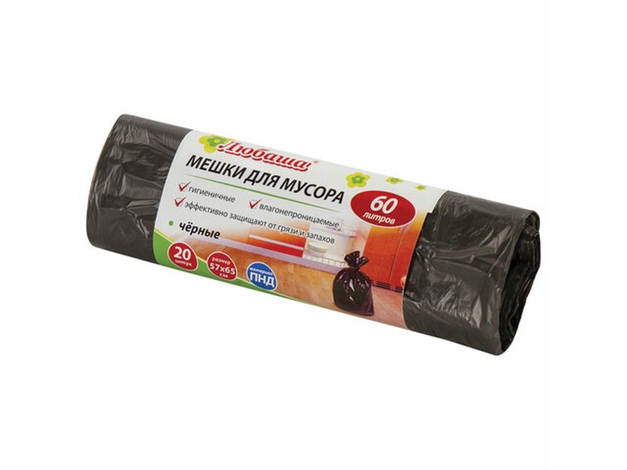 В корзину Купить в 1 клик Мешки для мусора 60литров "BR-78287", черные в рулоне 20 штук, ПНД, 5мкм, 57х65см (+5%), эконом