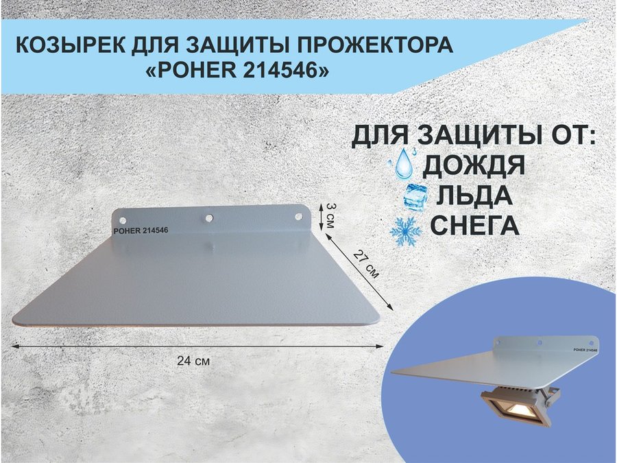 В корзину Купить в 1 клик Козырёк для защиты прожектора от дождя "POHER-214546" серый, сталь 2мм, вылет 27см, ширина 24,4см