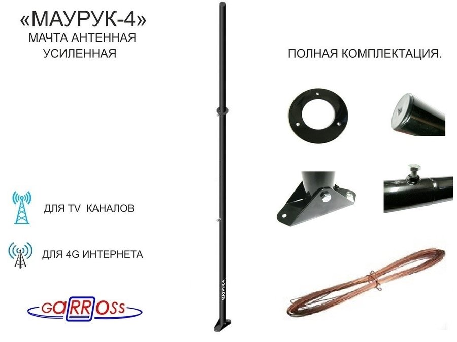 В корзину Купить в 1 клик Мачта "МАУРУК-3-11491" для антенн, чёрная усиленная с ручкой, растяжкам и подпятником, 51мм, 3 метра