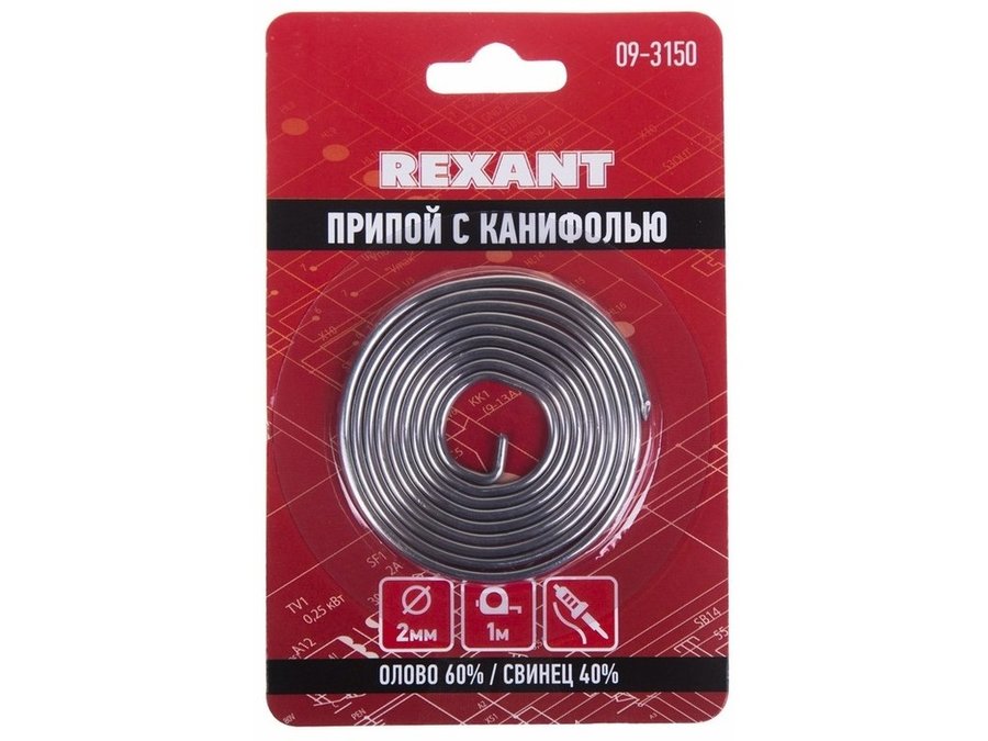 В корзину Купить в 1 клик Припой (спираль) с канифолью O2.0 мм, 1 м (Sn60 Pb40 Flux 2.2 %) блистер REXANT