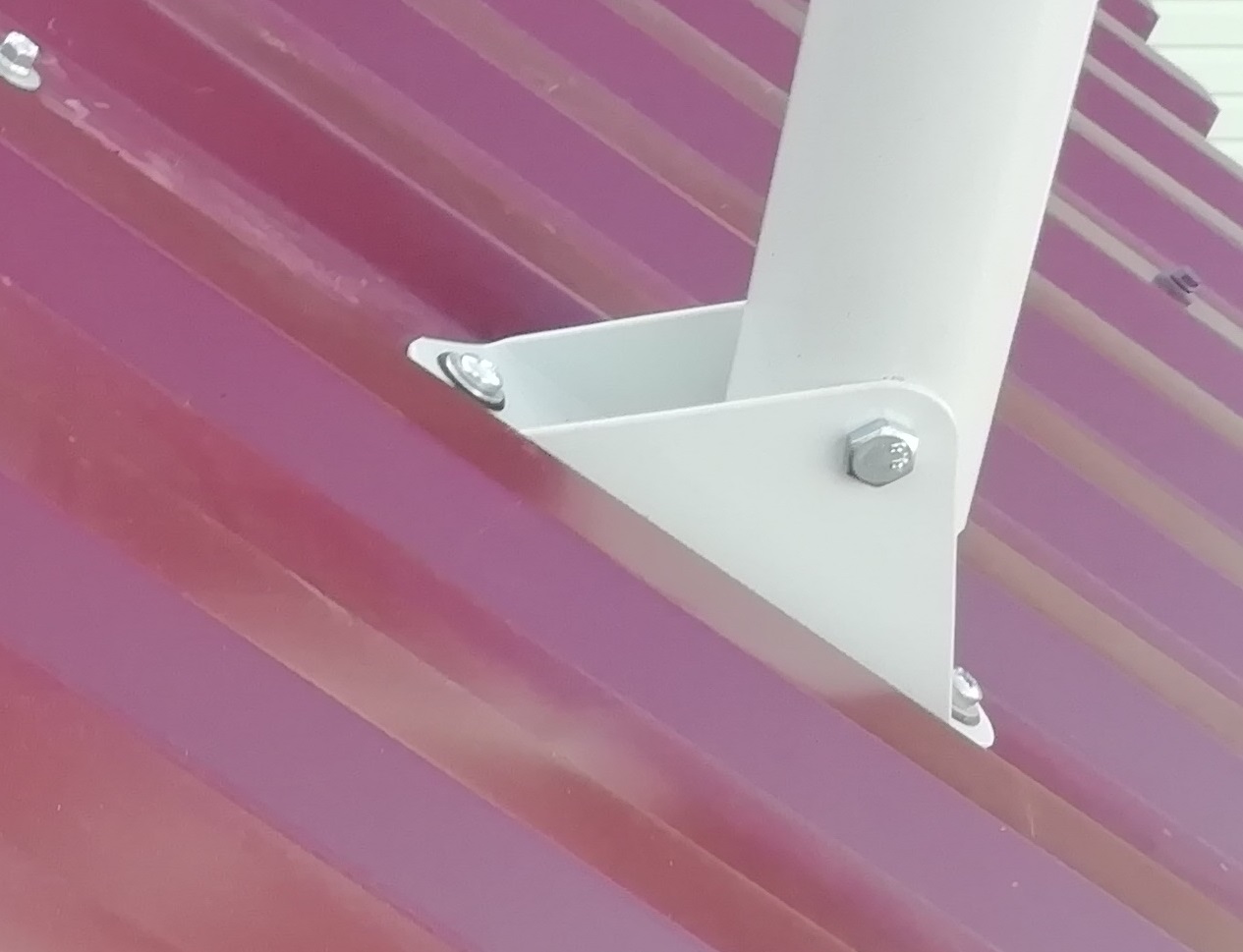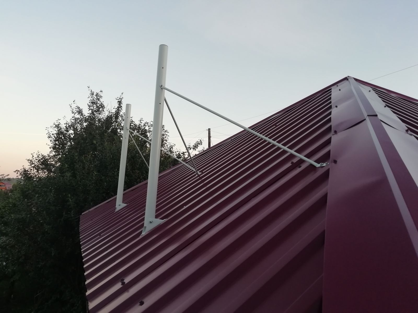 • Для крепления используются два отверстия в подпятнике и по одному отверстию в каждой растяжке. Удобно использовать кровельные саморезы максимального диаметра и длины, чтобы обеспечить надёжность фиксации.