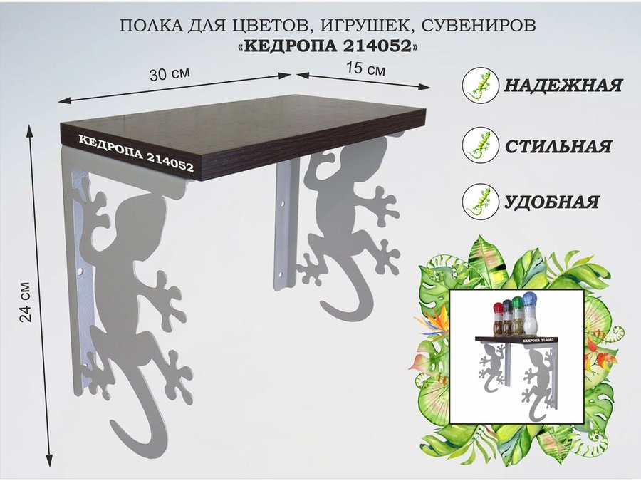 В корзину Купить в 1 клик Полка для цветов, игрушек, сувениров "КЕДРОПА-214052 гекон" размер 15х30х24 см, серый, венге
