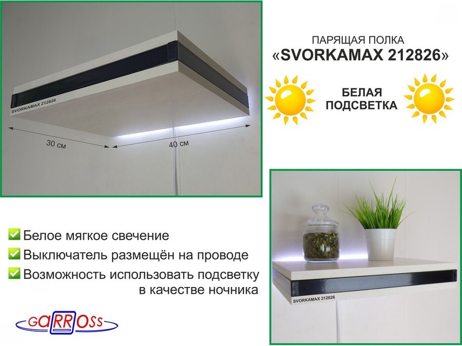 - Полка скрытого крепления укомплектована светодиодной подсветкой с выключателем на шнуре и блоком питания