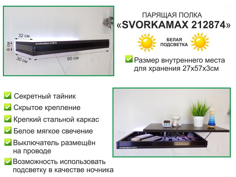 . Полки скрытого крепления с тайником, подсветкой "SVORKAMAX" парящие полки 60х30 см