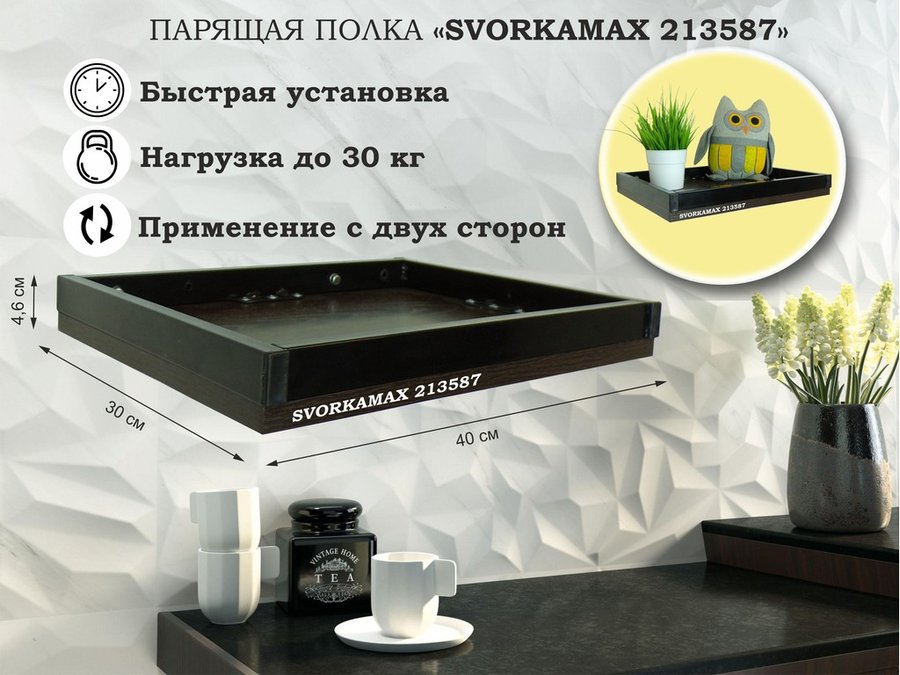 В корзину Купить в 1 клик Парящая полка скрытого крепления, бортики из металла , черный "SVORKAMAX 213587" 30х40 см, венге
