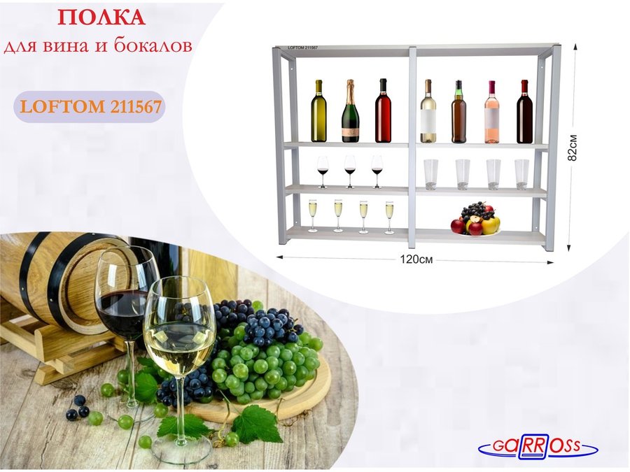 В корзину Купить в 1 клик Полка для вина и бокалов, высота 82см, 4 уровня, размер полки 10х120см, серая "LOFTOM 211659"салатов