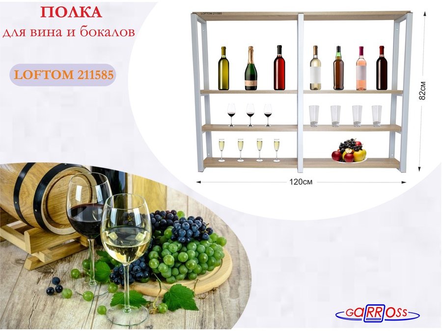 В корзину Купить в 1 клик Полка для вина и бокалов, высота 82см, 4 уровня, размер полки 10х120см, серая "LOFTOM 211585" дуб