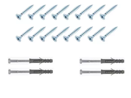 - Полка надежно крепится к стене при помощи шурупов с дюбелями, идущих в комплекте