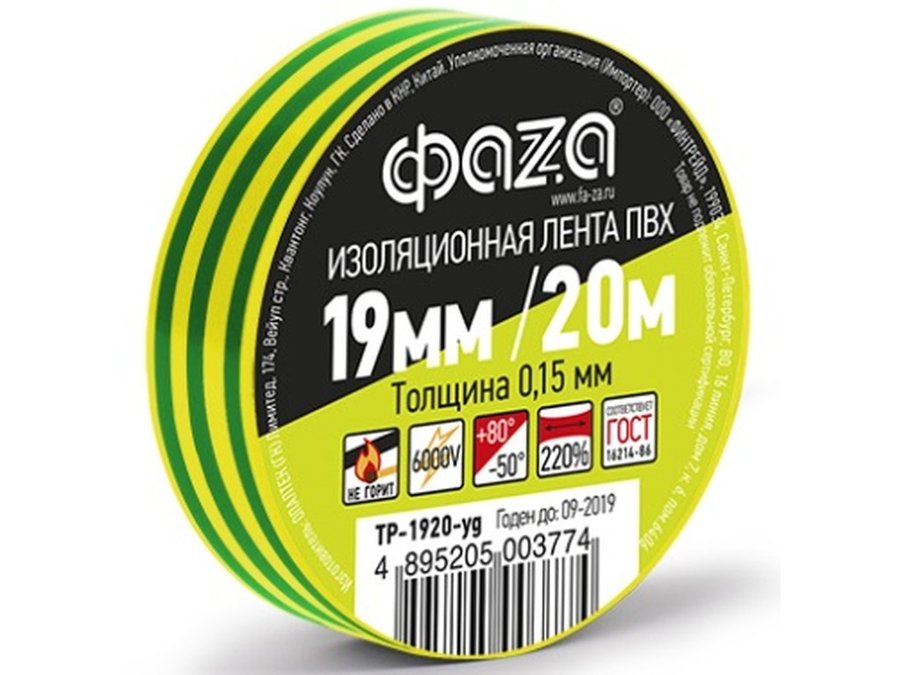В корзину Купить в 1 клик Изолента 19мм х 20метров желто-зеленая ФАZA ТР-1920