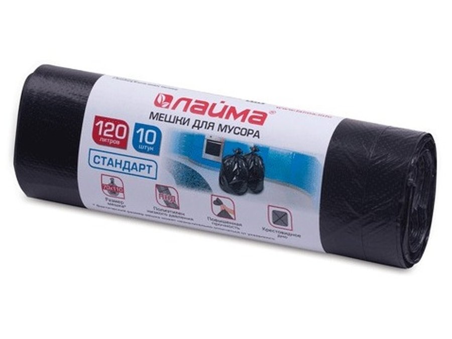 В корзину Купить в 1 клик Мешки для мусора 120литров, черные, в рулоне 10шт, ПНД, 14мкм, 70х110см(+5%), стандарт "BR-78266"