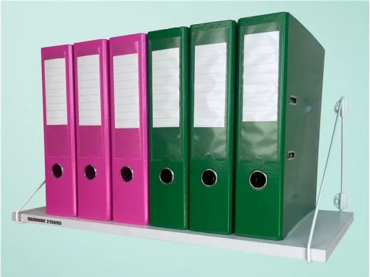 - Полка надежно крепится к стене при помощи анкеров или шурупов с дюбелями, на ней можно разместить папки, документы и многое другое
